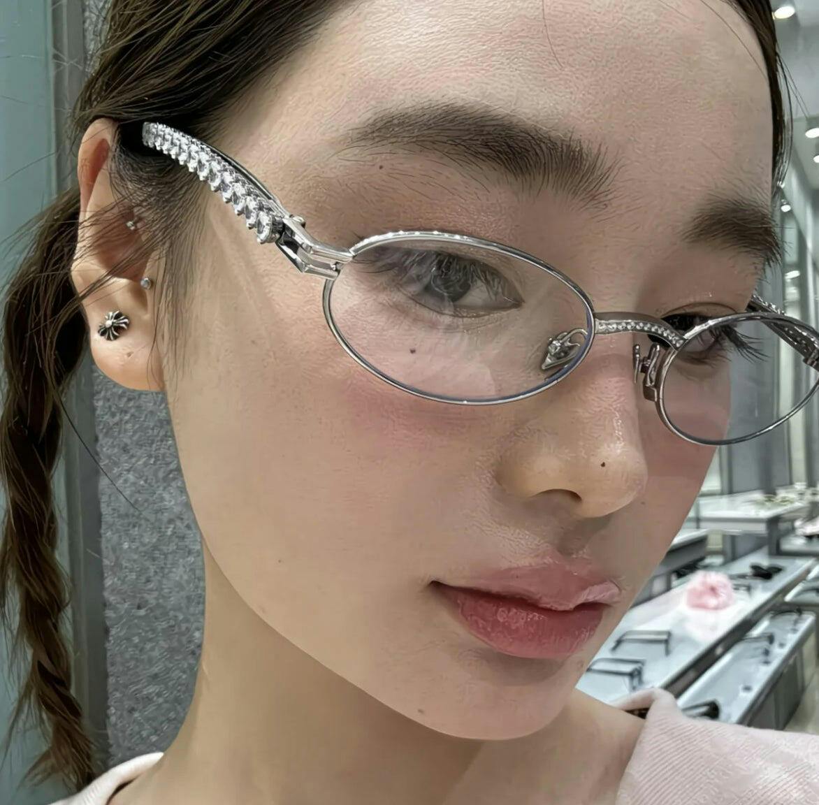 The slim metal frame offers a lightweight feel, while the temple arms are adorned with sparkling rhinestones for a touch of glamour.