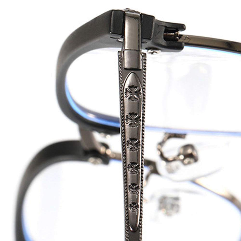 The striking upper frame is complemented by intricately engraved vintage patterns on the sides, adding a refined and unique detail to the design. Crafted for comfort, the lightweight metal rims ensure a secure and durable fit, making them perfect for everyday wear.