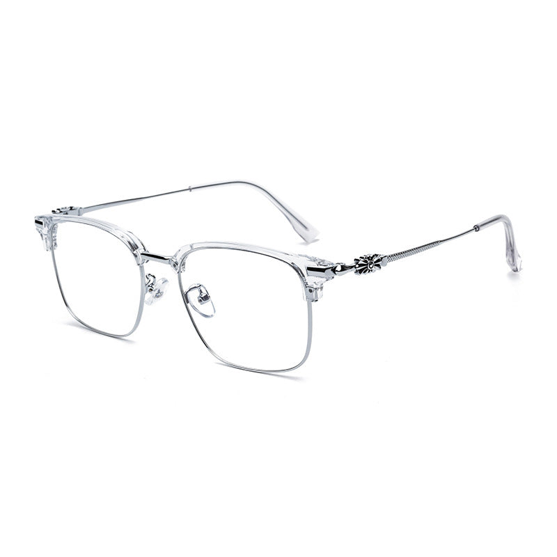 Delicate floral embellishments near the hinges provide a unique, stylish accent, while the slender metal arms and adjustable nose pads ensure a lightweight and comfortable fit.