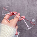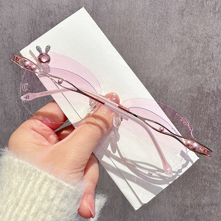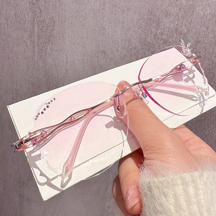These rimless glasses feature 3D bunny-shaped metal embellishments at the temple tips, creating an eye-catching decorative highlight. Gradient lenses can be customized to further enhance the overall cute and beautiful look.